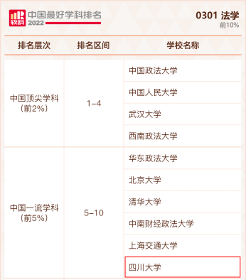 On September 21, 2022, Shanghai Ranking officially released the Best Chinese Subjects Ranking 2022. The list includes 96 first-class disciplines. A total of 108 universities which has the discipline of law were listed. The law discipline of Sichuan University has been ranked top 10 in China for two consecutive years, ranking among the top 5%.